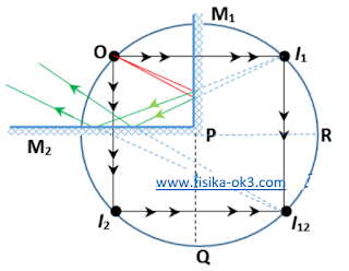 - Tarik garis dari I1 oleh cermin M2 hingga memotong lingkaran di juring RPQ, tidak mungkin lagi dibentuk bayangan dari I12.